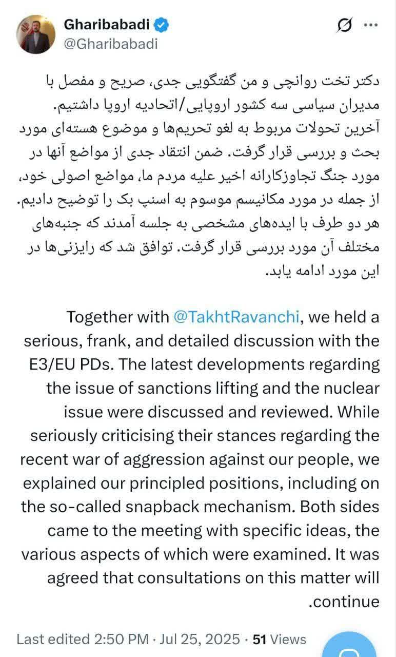 دکتر تخت روانچی و من گفتگویی جدی، صریح و مفصل با مدیران سیاسی سه کشور اروپایی/اتحادیه اروپا داشتیم.